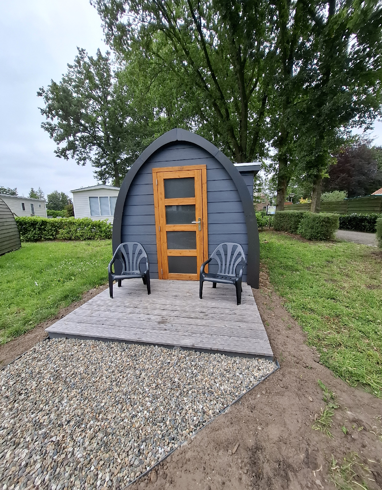 Als u van kamperen houdt, maar niet teveel kampeeruitrusting wilt meenemen, dan is overnachten in een Pod écht iets voor u! Een Pod is een klein, knus houten huisje met een bed, toilet en een klein keukentje (waar niet gekookt kan worden). Er is geen douche aanwezig in de Pod, hiervoor kunt u terecht in het nabij gelegen sanitair gebouw.